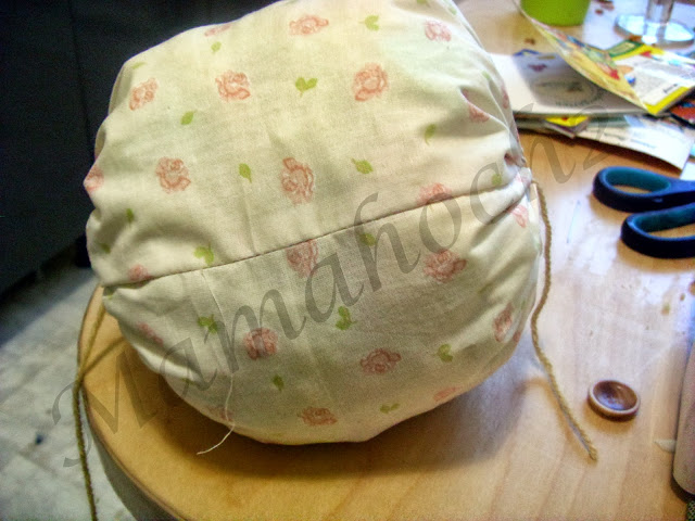 Wenn ihr oben seit mit der Füllung schlagt ihr den Stoff circa 2 cm nach innen. Auch hier wird mit Nadel und Faden wieder gekräuselt (genauso wie oben).
