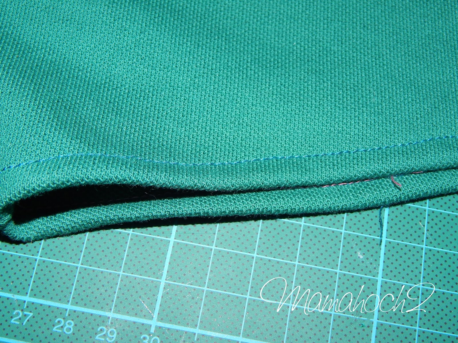 Nun kann es auch schon an das Zuschneiden gehen. Nehmt euch Stoff eurer Wahl – in meinem Fall grüner Polostoff von Trigema und Bündchen.