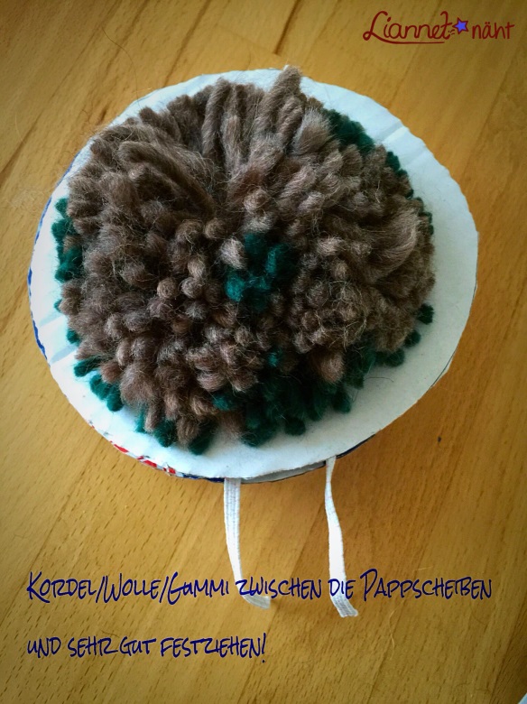 Bei meiner dicken Wolle waren es so 3-4 Lagen. Wenn man das Gefühl hat es reicht, wird zwischen den Schablonen die Wolle aufgeschnitten, schön vorsichtig damit die Fäden nicht rauspurzeln… und ganz vorsichtig Kordel oder Gummi einziehen und so fest wie es geht verknoten. Man kann auch die Wolle nutzen und daraus eine Schnur häkeln.