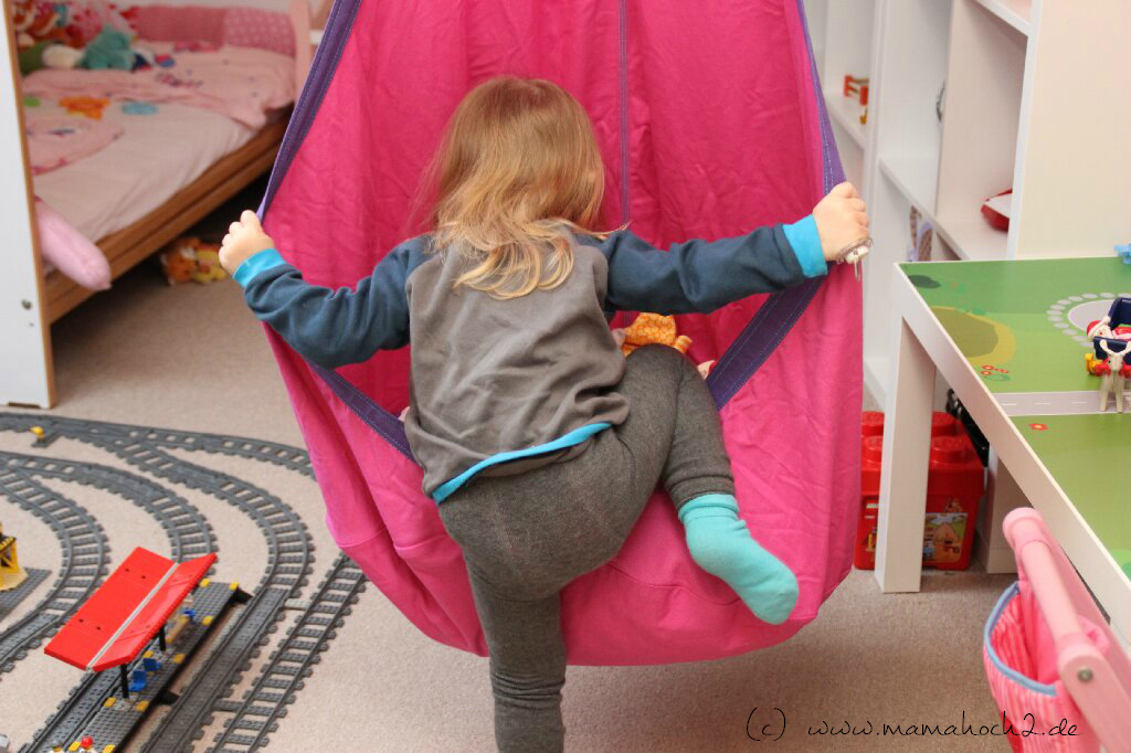 Der große Sohn hat eine Hängematte, die wahlweise an 2 Stellen hängemattenüblich oder an einer Aufhängung an der Decke befestigt werden kann. Damit ist man in der Verwendung noch flexibler und wir konnten sie immer toll für Spiele nutzen, die er auch bei der Ergo gemacht hat. Noch heute mit 10 Jahren nutzt er sie gerne.