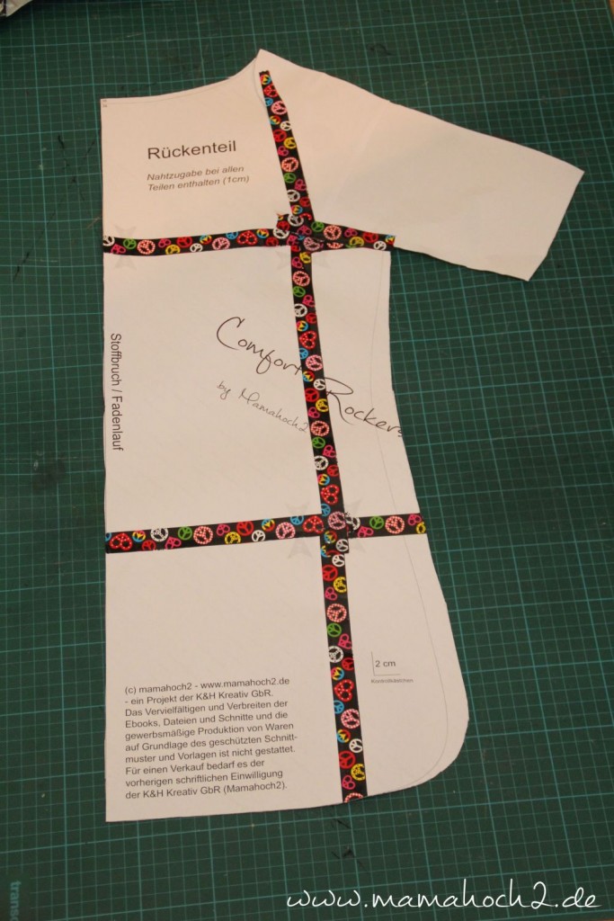 7. Das Schnittmuster kann nun auf den Stoff losgelassen werden. Schneidet zunächst einmal euer Vorderteil zu und euer Rückteil inkl. der gerade befestigten, halben Ärmel.