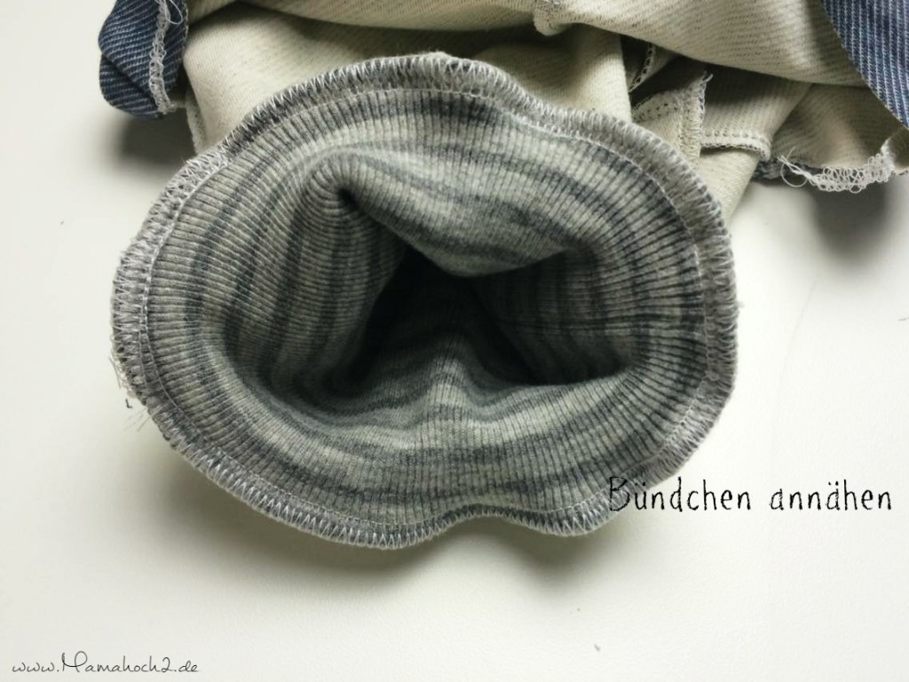 Nach dem Zuschnitt wird das Bündchen zusammen genäht. Die Naht gut ausgeformt und gewendet. Im Anschluss wird das Bündchen an das Hosenbein gesteckt. Achtet auf eine gute Verteilung damit das Bündchen gleichmäßig gedehnt wird.
