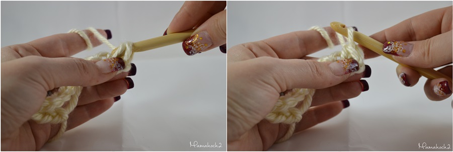 Um zurück zu häkeln nimmst die Häkelnadel und steckst sie in die 2.!! Luftmasche. Wenn du das gemacht hast, sind von unten 2 Schlaufen auf der Nadel und von oben 3 Schlaufen auf der Nadel.