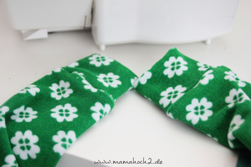 Am Ärmel fehlen jetzt noch die Bündchen. Diese habe ich genauso breit zugeschnitten, wie der Umfang des Ärmels groß ist, da Frottee nicht so dehnbar ist wie Bündchen. Am Ende haben wir dann den gesamten Bademantel aus Frotteestoff und somit auch perfekt für den Einsatz zum Trocken werden. Natürlich kannst du an dieser Stelle auch normale Bündchenware nutzen, diese wird dann aber eher nass bleiben.