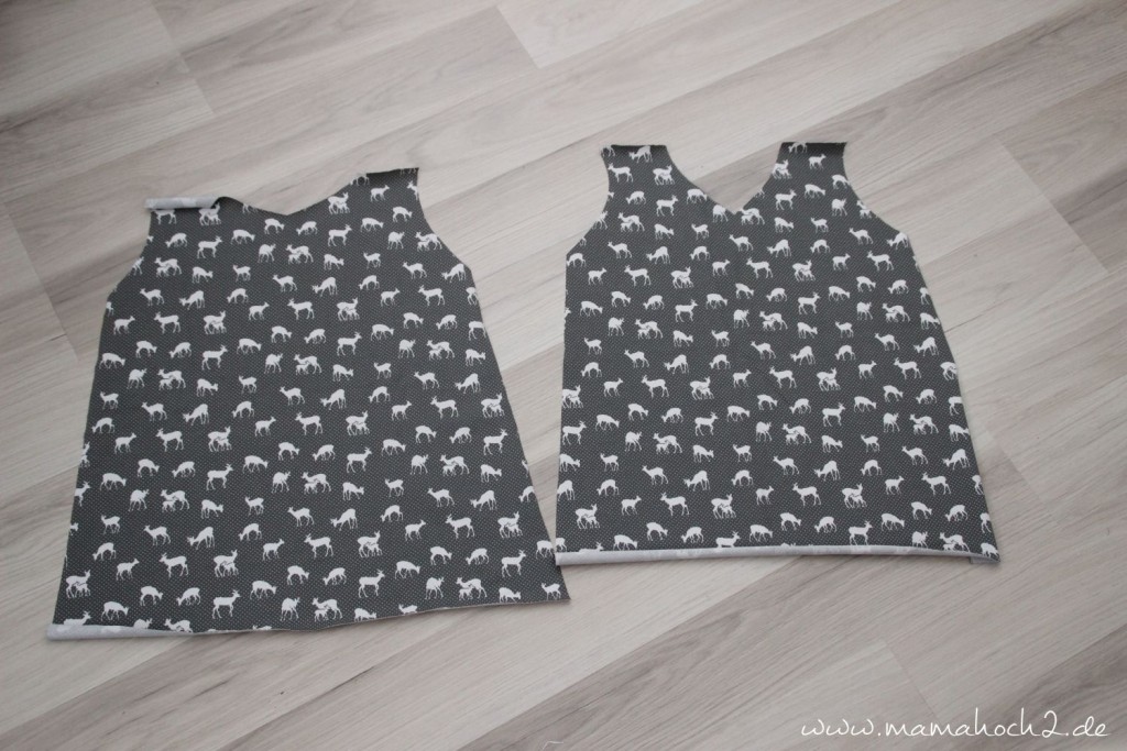 Nähe nun die Achseln und die Ausschnitt am Hals. So verbindest du Belege und Hängerchen. ACHTUNG: Oben an den Schultern lässt du alles noch offen.