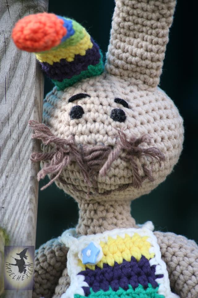 Nicole hat ihren Hase richtig bunt gehäkelt. Sie hat mit einer Verlaufswolle gehäkelt und dadurch kommt dieser tolle Effekt. Der Hase entstand mit einer 6er Häkelnadel und ist dadurch stolze 60 cm groß geworden. Nicole findest du mit ihrer Seite bei Facebook unter Nicole’s Mäusewelt.