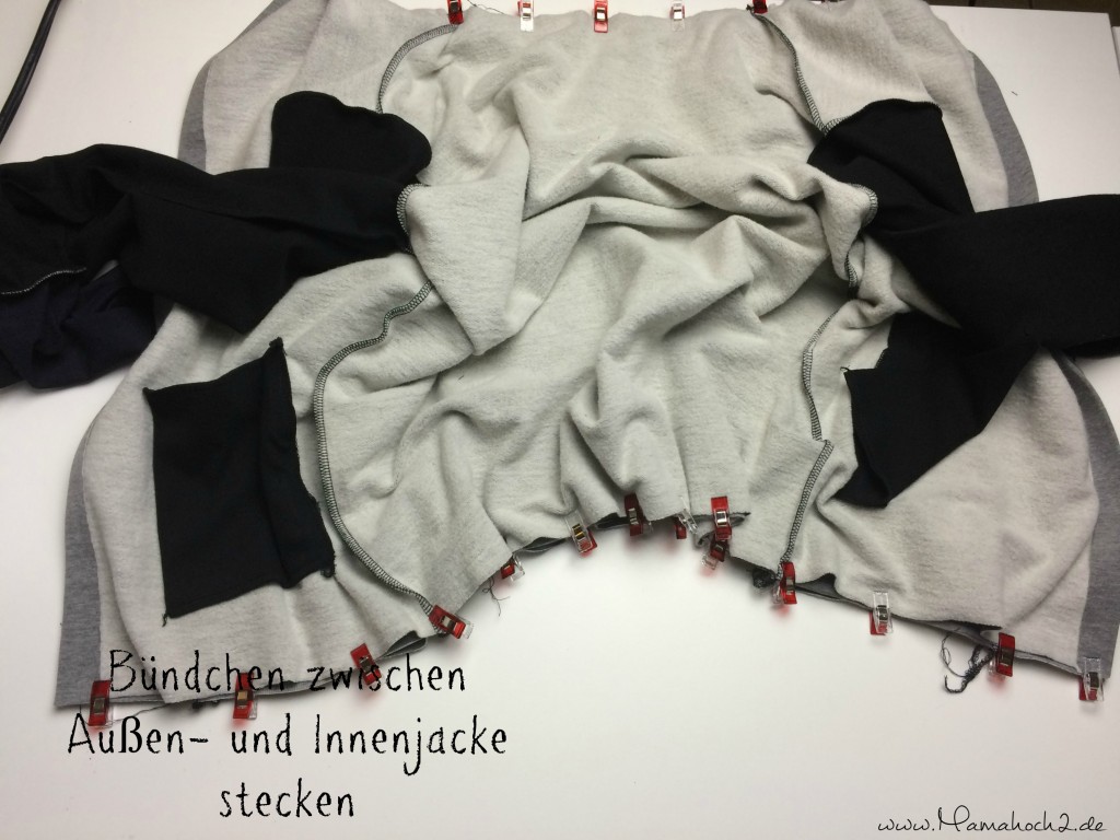 Nun wird es wieder etwas kniffelig. Wende beide Jacken auf die linke Stoffseite und lege sie genau gegenüber voneinander hin. Schlage die Außenjacke etwas zurück, Stecke das Bündchen an und stecke anschließend die Innenjacke darüber. Alle Öffnungen zeigen in eine Richtung. Es liegen nun 4 Lagen Stoff (1x Außenjacke, 2x Bündchen, 1x Innenjacke) aufeinander und nähe diese nun zusammen.
