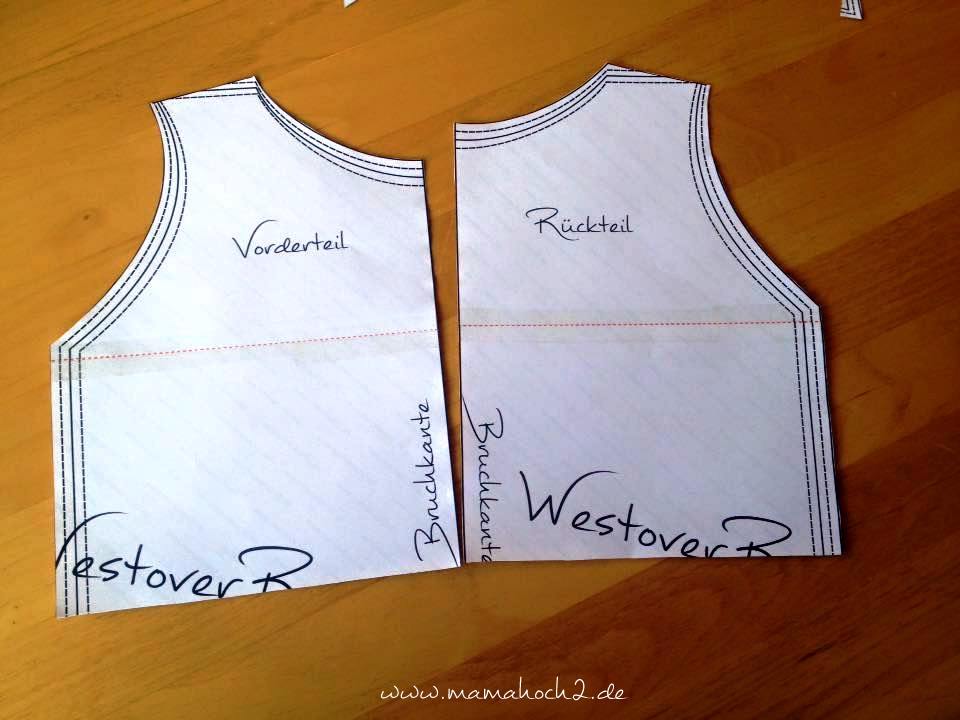 Am einfachsten haltest du das Schnittmuster einfach mal an das Kind und überlegst wie kurz die Weste sein soll (bedenke aber ca. 1 cm für die Nahtzugabe).
