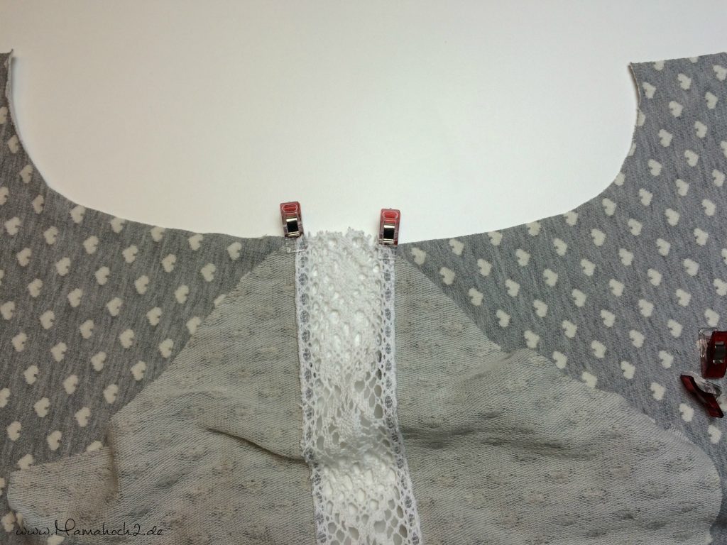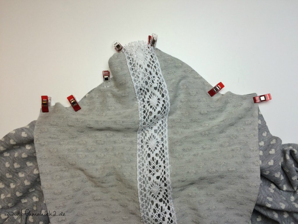 Ich habe beispielsweise kleine Schleifen im Nacken und am Ärmelabschluss angenäht: