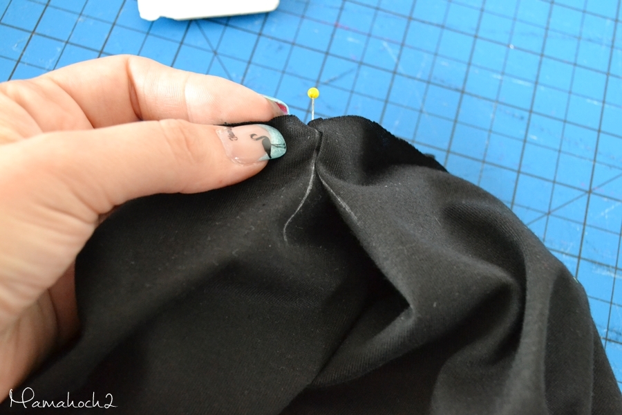 Leg nun die beiden Markierungen rechts auf rechts aufeinander. Steck dir eine Nadel genau auf die Striche. Da hast du einen sauberen Zusammenstoß. So hast du “innen im Shirt” eine Schlaufe.