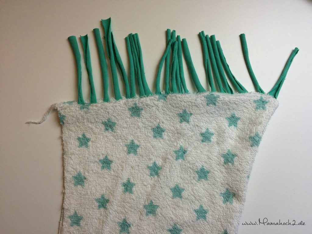 Mein Sohn hat sich Fransen gewünscht. Wenn du dies auch machen möchtest schneidest du dir einfach ein paar Jerseystreifen zu und ziehst diese etwas in die Länge damit sie sich zusammen rollen.
