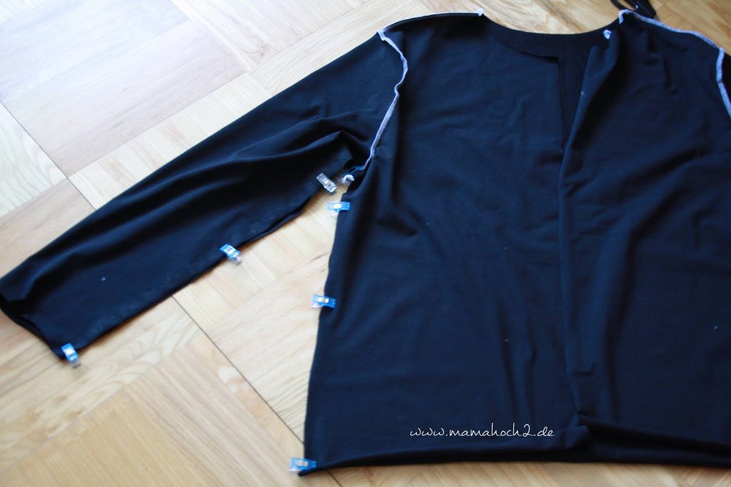 Zurück zur Außenjacke. Lege sie mit der schönen Seite nach unten vor dich und stecke die Ärmel rechts auf rechts fest; nähe die Ärmel an.