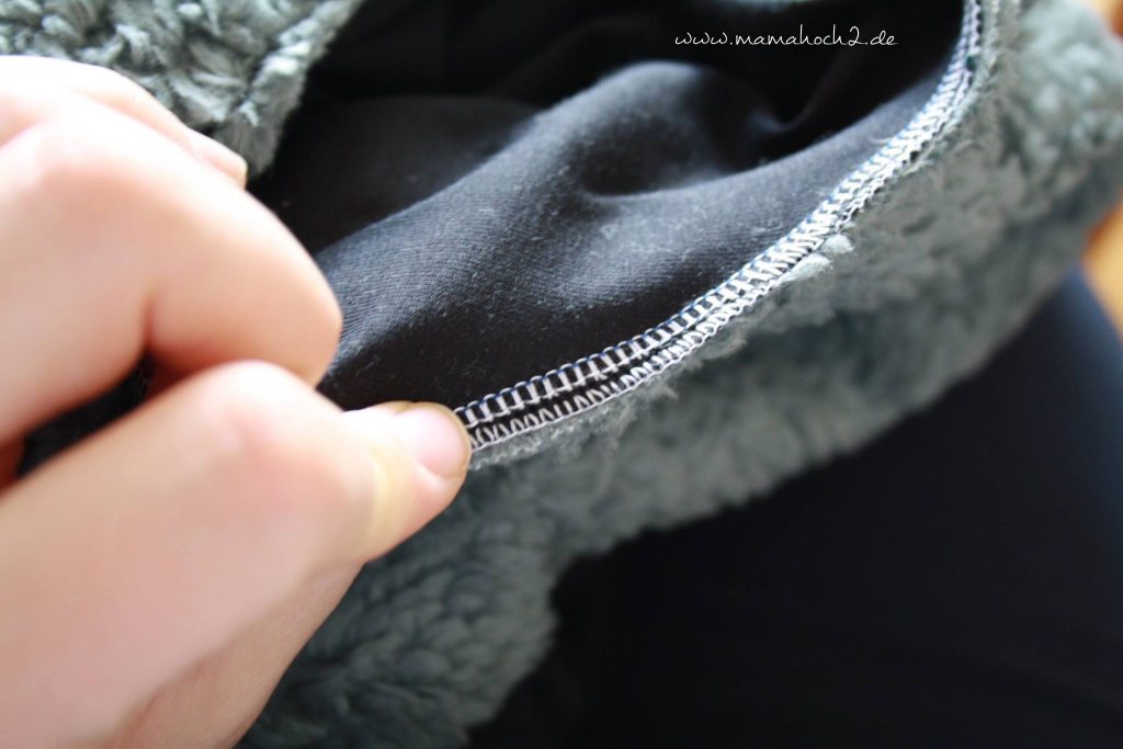 Berechne nun dein Bündchen mit der bekannten Formel (Umfang ausmessen und mal 0,7 cm multiplizieren) und stecke es an Außen – und Innenteil fest. Somit hast du auch hier Innenfutter und Außenjacke verbunden. Wenn du eine ausführliche Videoanleitung zum Bündchen anbringen möchtest, KLICKE HIER.