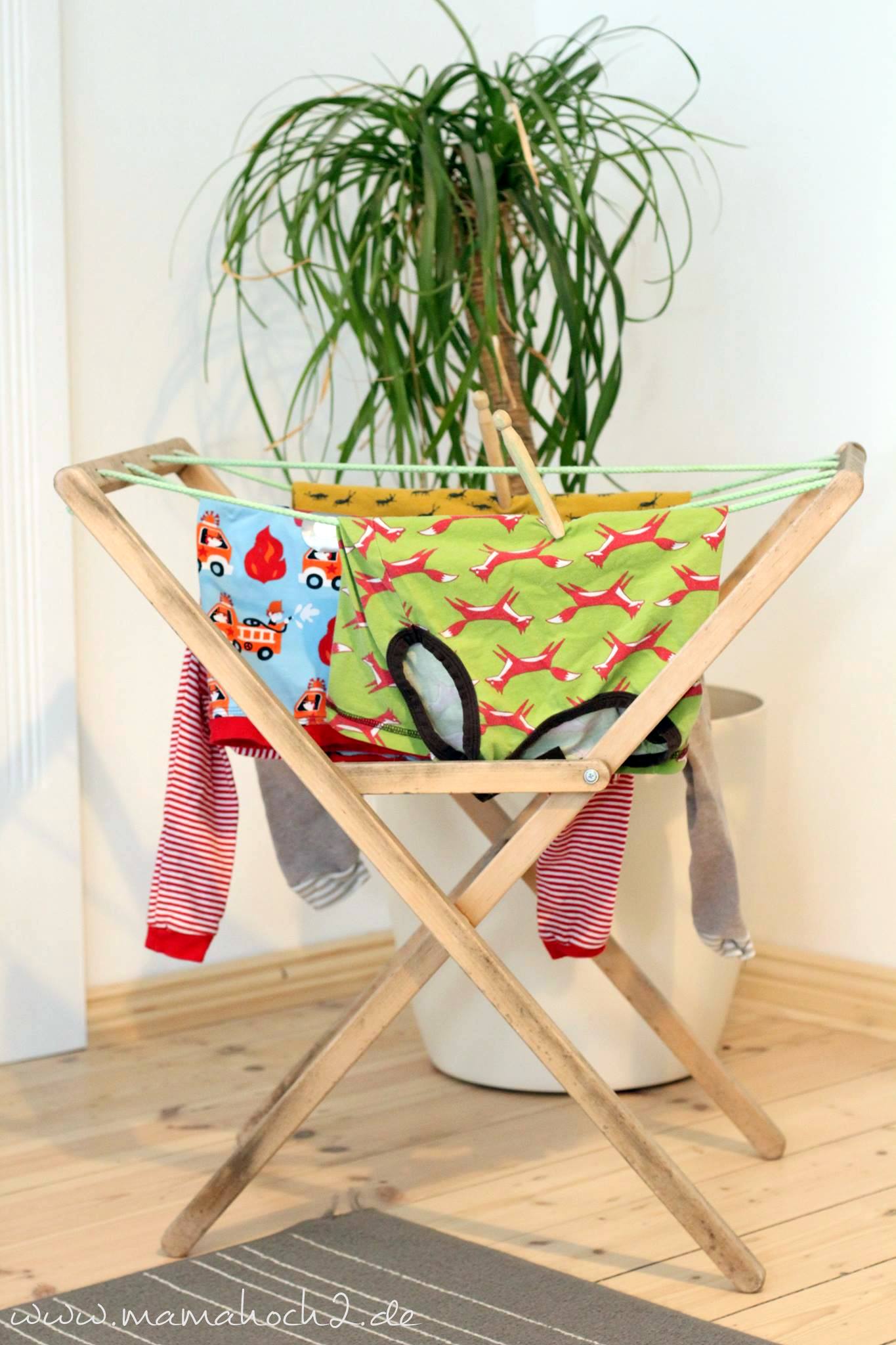 Alternativ dazu eignet sich auch ein 2-stöckiger Wäscheständer, wie ihn Bianca benutzt. Dort kann Mama oben aufhängen und das Kind das untere Abteil beanspruchen 😉