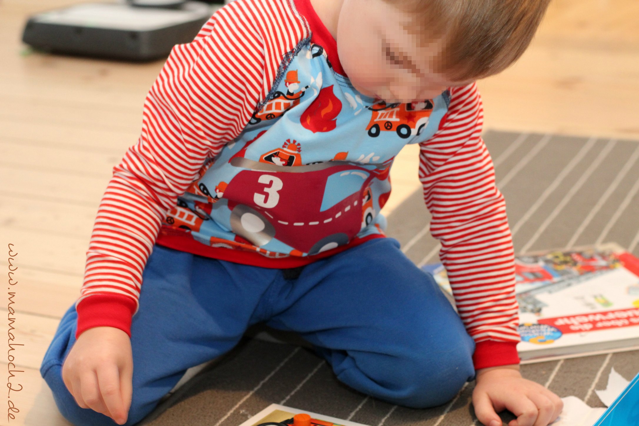Ganz heiß geliebt wird auch das Geburtstagsshirt, dass ich ihn dieses Jahr genäht habe. Er wünschte sich lange einen Feuerwehrpullover und auch hier ist es wieder mal ein Autumn Rockers geworden in der Größe 104 (Oh gott, wo wächst der Kerl nur hin?). Der Stoff gefiel mir auf Anhieb und ich hatte sofort die Idee im Kopf eine große Feuerwehr darauf zu plotten. Glücklicherweise hatte Paul & Clara eine wundervolle Datei im Adventskalender enthalten.