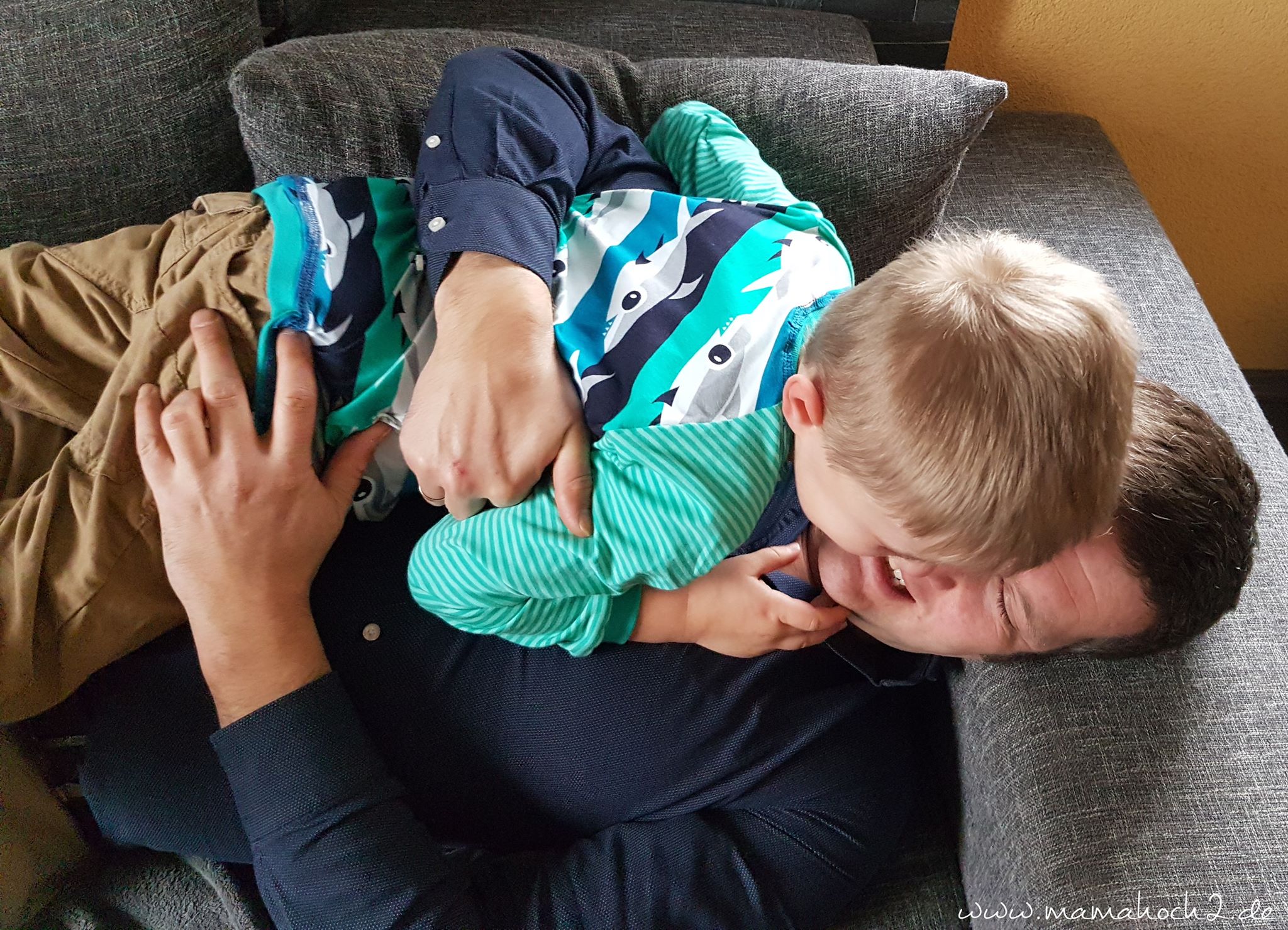 Der Große durfte auch in den Genuss eines neuen Autumn Rockers kommen und so nähte ich ihm aus dem coolen Stoff von Shalmiak *klick* ein Shirt für den Kita-Alltag. Er ist auch furchtbar gewachsen und plötzlich so groß <3 Die Haie habe ich mit mintfarbenen Streifenjersey kombiniert.