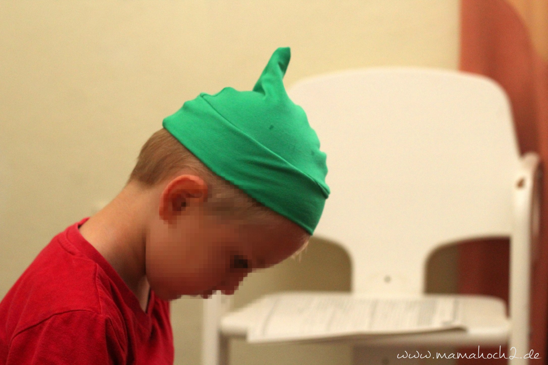 Zunächst nimmst du eine vorhandene Mütze deines Kindes und legst diese auf ein Papier. Markiere den Anfang und das Ende der Mütze. Sie liegt dabei natürlich nicht kreisrund auf dem Papier, sondern so wie die Mütze auf dem Foto unten. Nun zeichnest du grob die Form nach, wie sie für Peter Pan üblich ist. Dein Anfangs und Endpunkt geben dir vor, wie groß die Mütze sein muss. Vergiss die Nahtzugabe nicht!!