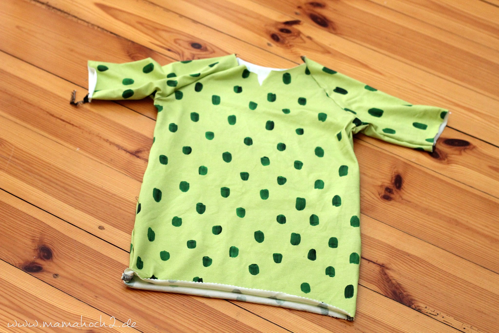 Vernähe nun die Schnittteile nach Anleitung. Die Ärmel werden an das Vorderteil genäht und an das Rückteil und anschließend wird ab Armbogen an nach unten hin geschlossen. Wenn du dir unsicher bist, solltest du unbedingt die oben verlinkte Anleitung öffnen.