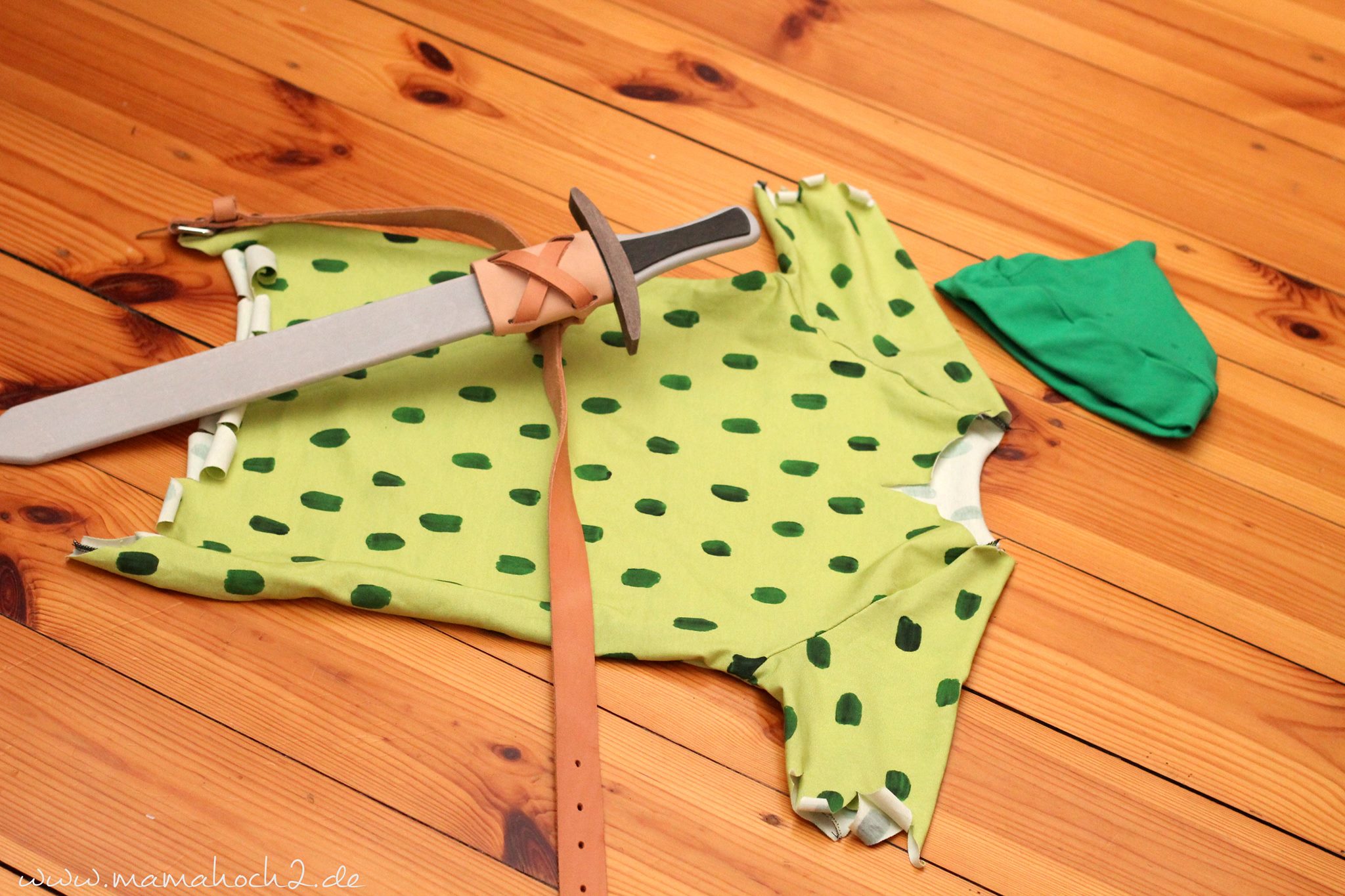 Wie eingehend schon erwähnt, zeige ich in der Anleitung, wie man unser vorhandenes Raglanschnittmuster Autumn Rockers nutzen kann, um daraus mit ganz wenig Aufwand ein Peter Pan Kostüm zu zaubern. Die Idee eines Peter Pan Kostüms ist natürlich nicht neu, aber dieses aus unserem Schnitt zu machen, dann doch irgendwie 😉 Bei der Hose war ich ehrlich gesagt total faul und habe einfach eine grüne Jogginghose aus dem Schrank gezogen, aber auch hier könnte man theoretisch unser Schnittmuster Jogging Rockers nutzen. Der Gürtel ist ein gekaufter Gürtel für Schwerter mit passendem Holzschwert. Aber auch den könnte man natürlich selber nähen.