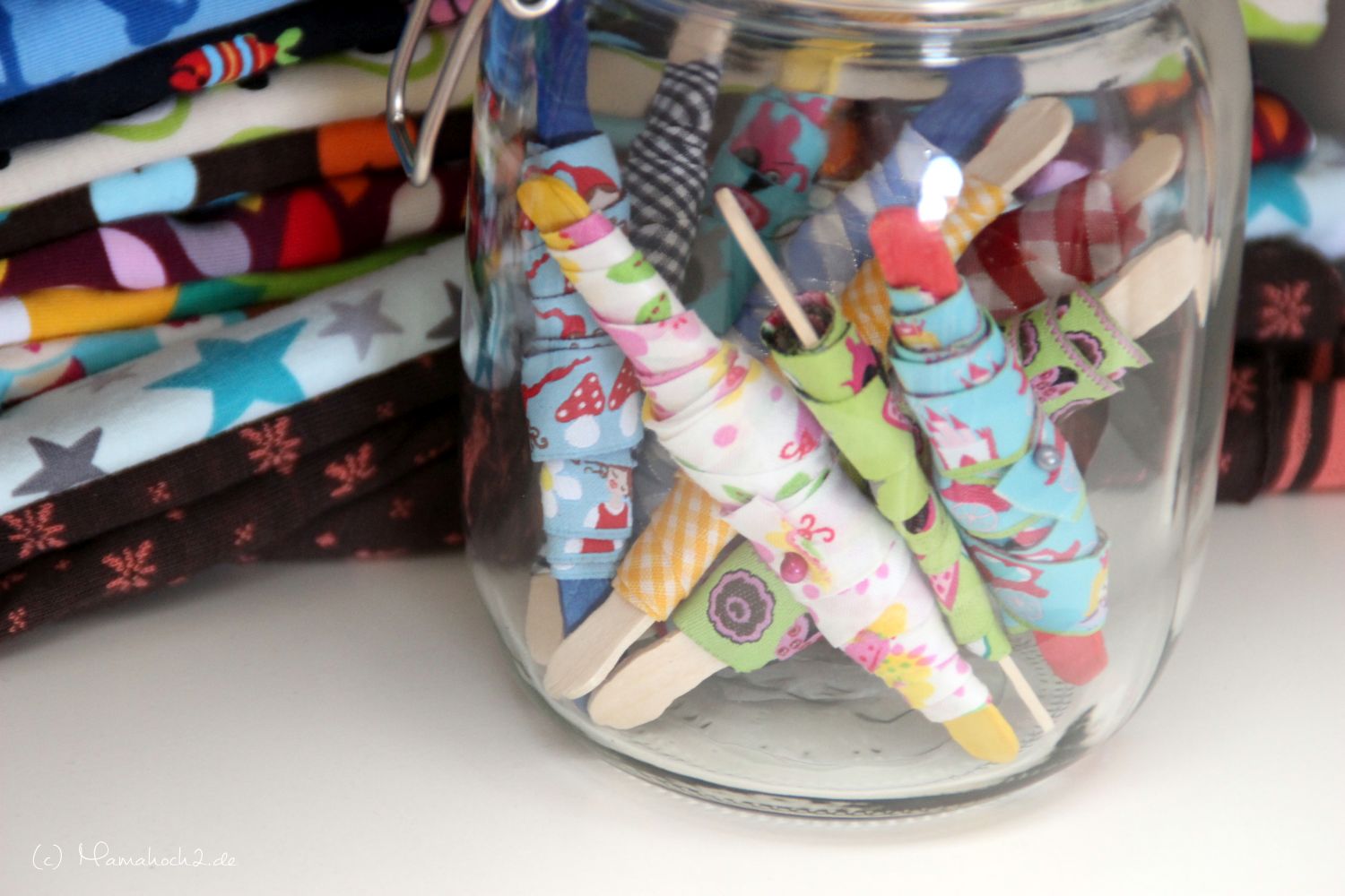 Im Nähzimmer und auch den Kinderzimmern befinden sich Nähutensilien und Zubehörsachen in Gläsern.