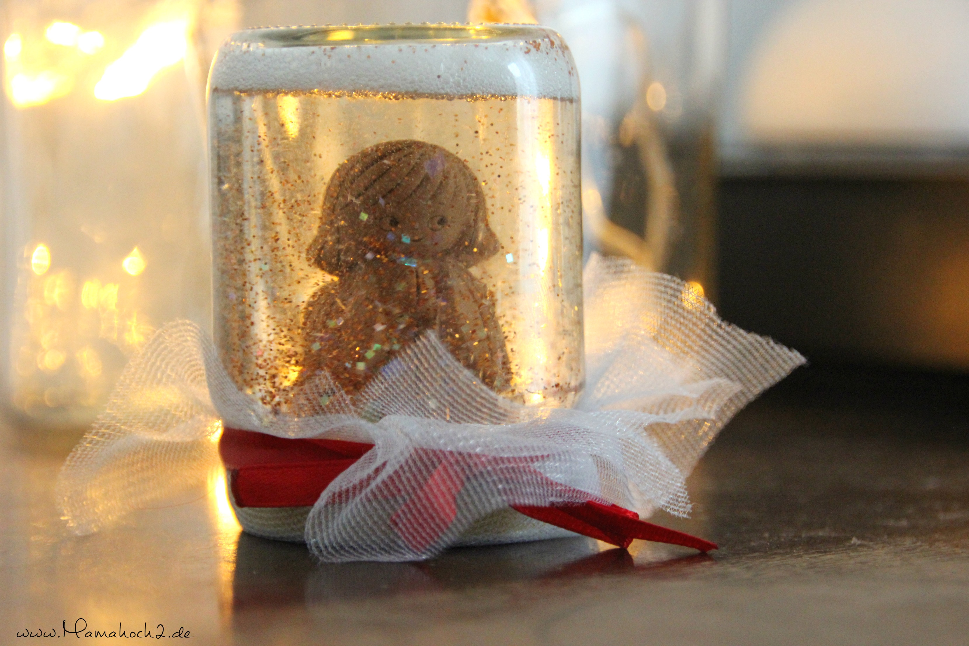 Wie wäre es mit einer Schneekugel für die Kinder? Hergestellt aus einem Glas Marmelade.