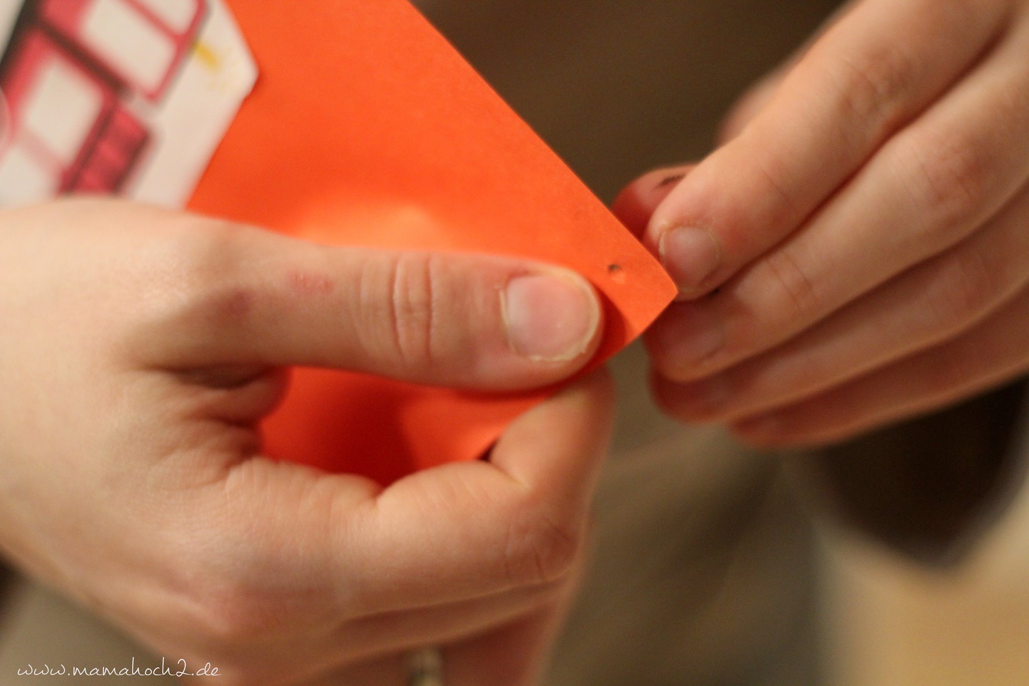 Mit dem Spießer werden nun rechts und links am Blatt löcher eingestochen und anschließend eine Schnur durchgefädelt.