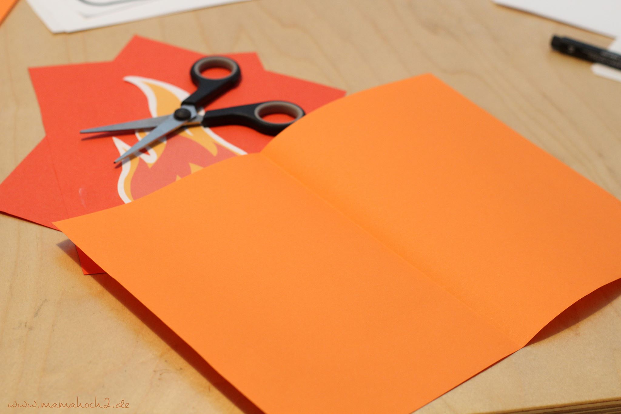 Auch eine Girlande lässt sich ganz einfach basteln. Hierzu habe ich orange, gelbe und rotfarbene Tonpapiere halbiert (also A5 groß) und anschließend mit dem PC die Motive farbig ausgedruckt. Diese werden dann ausgeschnitten und auf das Papier mittig geklebt.