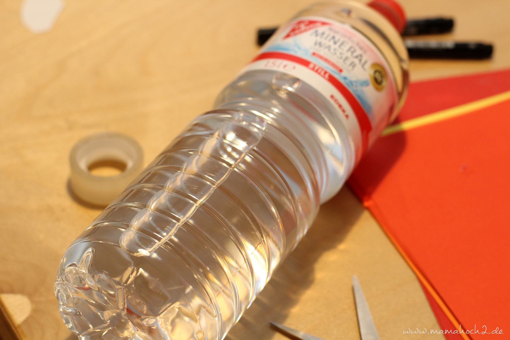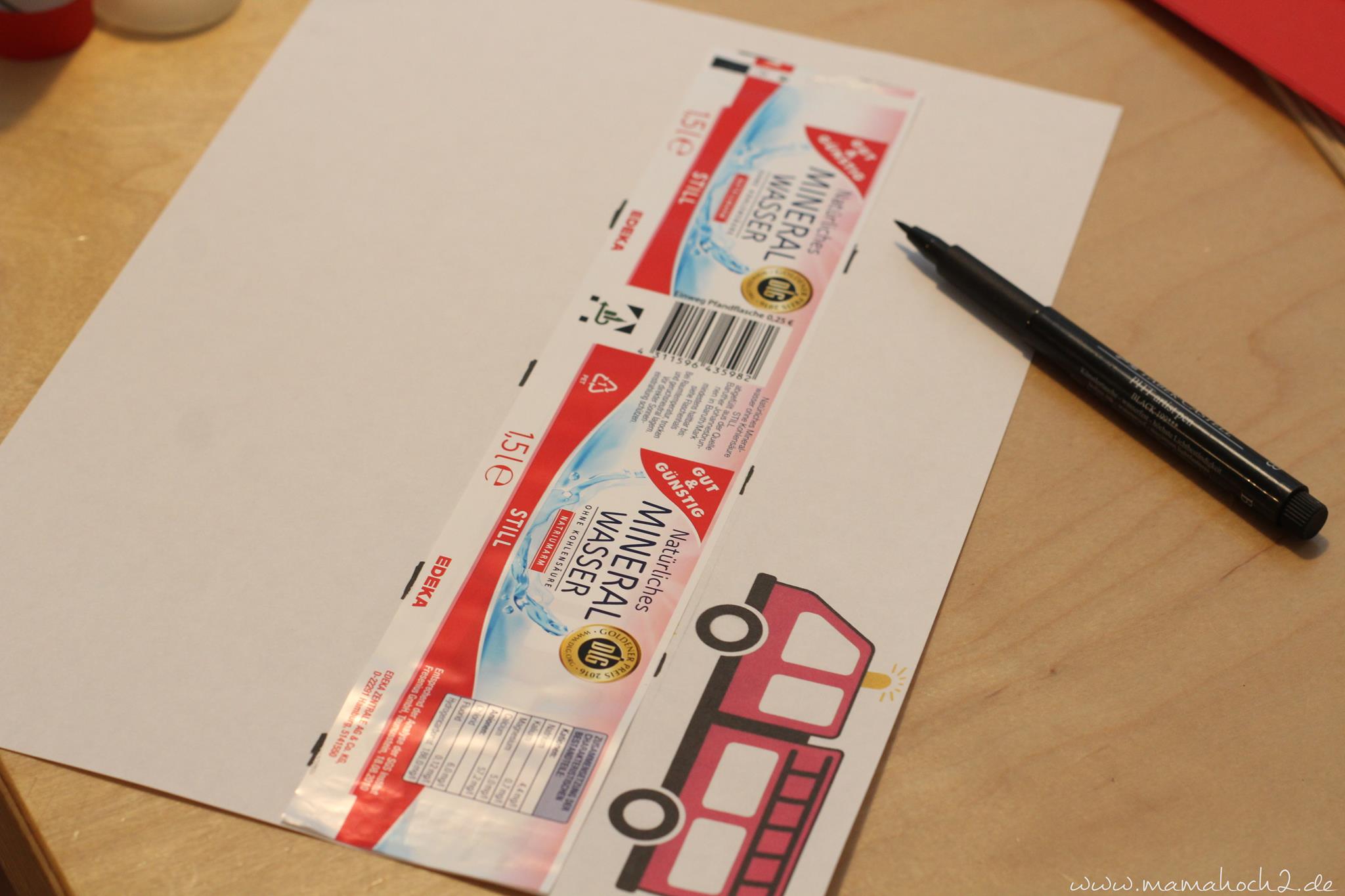 Diese Idee habe ich bei Pinterest gesehen und fand es klasse. Du brauchst dafür eine Wasserflasche, Papier, Stifte und passende Motive sowie Kleber oder Klebestreifen.