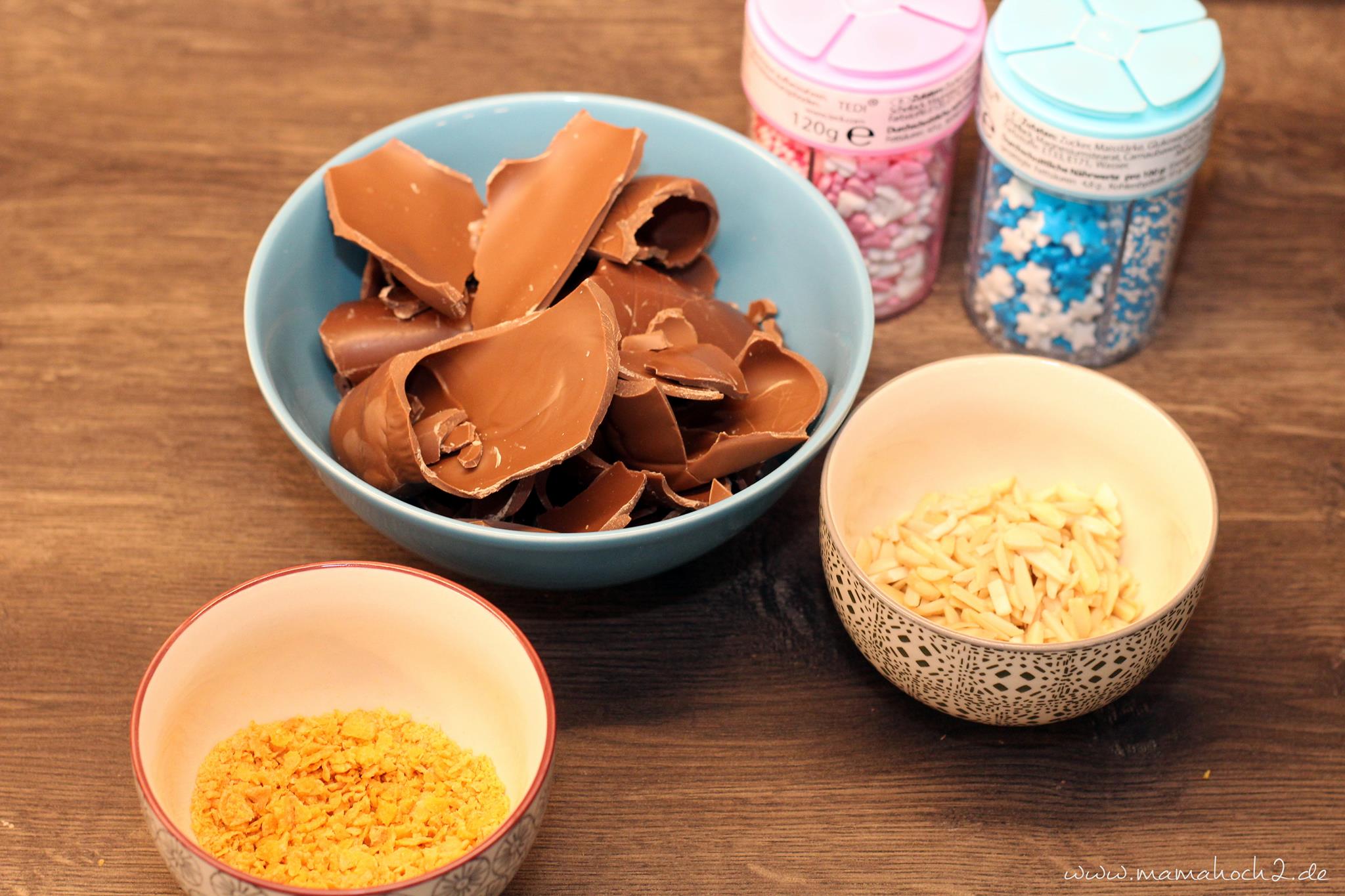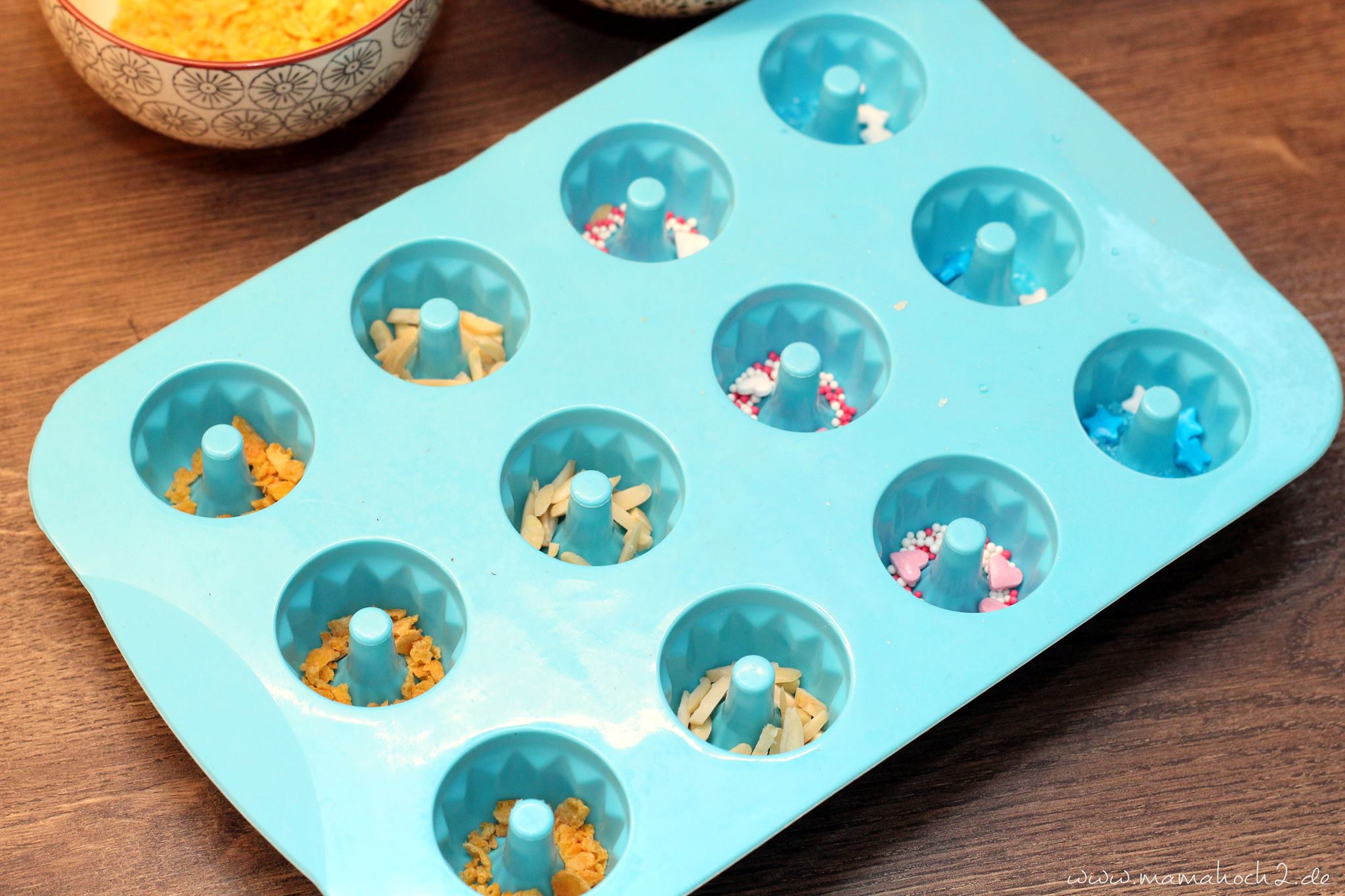 Während die Schokolade sich verflüssigt, kannst du bereits erste Vorbereitungen treffen und füllst in deine Miniform deine ausgesuchten Zutaten so, dass sie den Boden bedecken. Bei mir waren es Mandelsplitter, Conflakes Classic und bunte Streuseln. Auf dem Foto kannst du es gut erkennen.