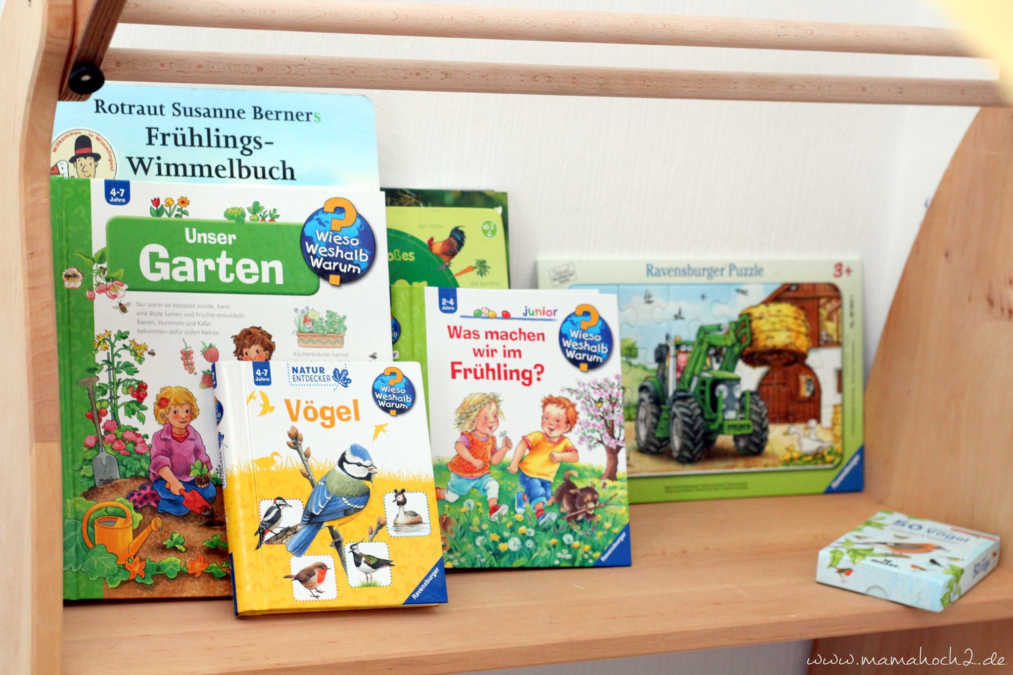 In meinem Beispiel habe ich wie beschrieben den Frühling für die Kinder verarbeitet. Auf dem Spielständer finden sich thematisch passende Bücher zum Frühling. Wir haben uns dabei besonders mit den Vogelarten beschäftigt und dem Garten. Ich achte darauf, dass es nicht zu viele Bücher sind und dass diese so gestellt werden, dass die Kinder direkt sehen können, was sie im Buch erwartet.