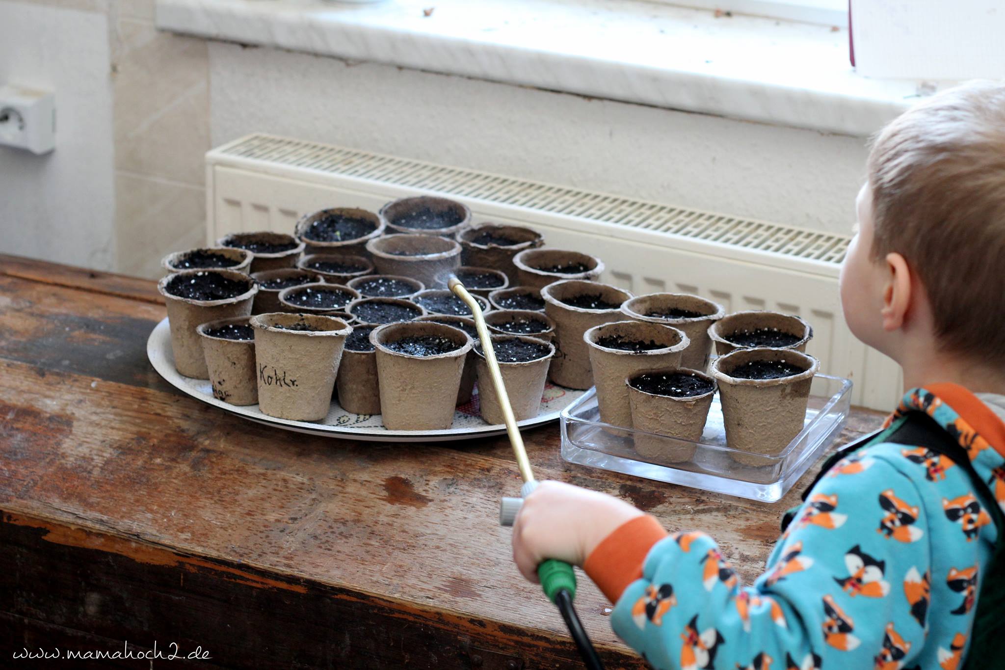 In einer weiteren Box hatten die Jungs Saatgut, dass wir gemeinsam ausgesät haben. Inzwischen ist schon ordentlich etwas aus unserem “Projekt” gewachsen und wir beobachten den Fortschritt täglich. Das Gießen wird dabei gerne übernommen. In der nächsten Woche wird der Große dann mittels von mir vorgelegten Buchstaben die Pflanzschilder beschriften dürfen. Er liebt solche “Spiele” und ganz nebenbei prägen sich Buchstaben ein und die Namen des jeweiligen Gemüses.