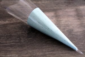 Tipp: Die Tüte sollte sich oben ausreichend schließen lassen. Sollte deine noch zu groß sein, ist jetzt ein guter Zeitpunkt sie noch zu kürzen. Hierfür schneidest du von oben einfach die Rundung nochmals nach. Perfekt ist es, wenn 1/4 der Tüte übersteht.