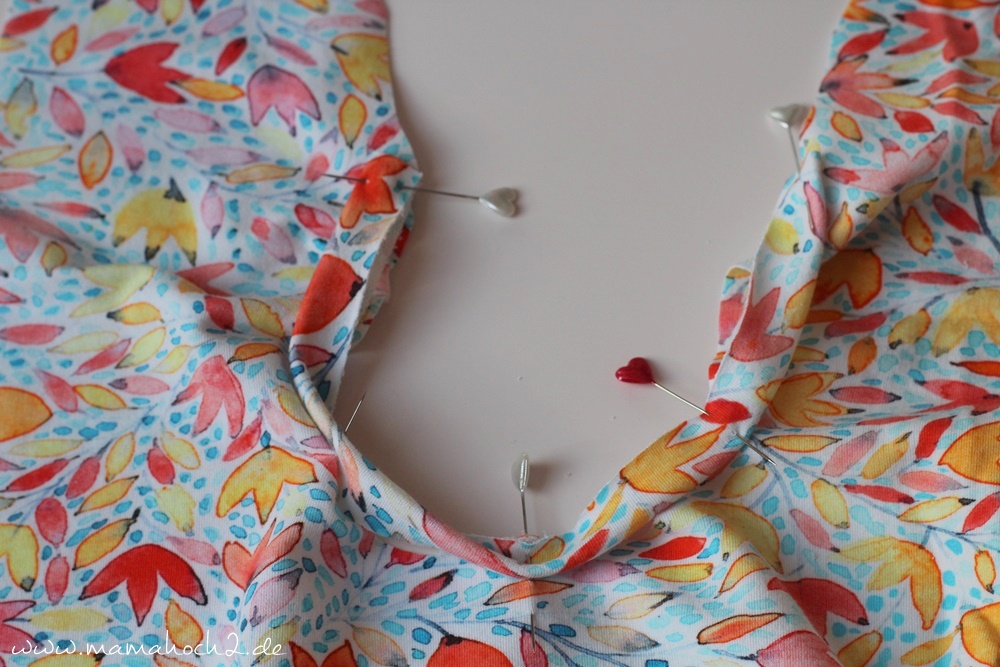 Stecke das Bündchen an deinem Halsausschnitt fest. Gehe hier genauso vor, wie am tiefen Ausschnitt. Stecke die Mitten aneinander, dann die Kanten und eins zwei Nadeln dazwischen.