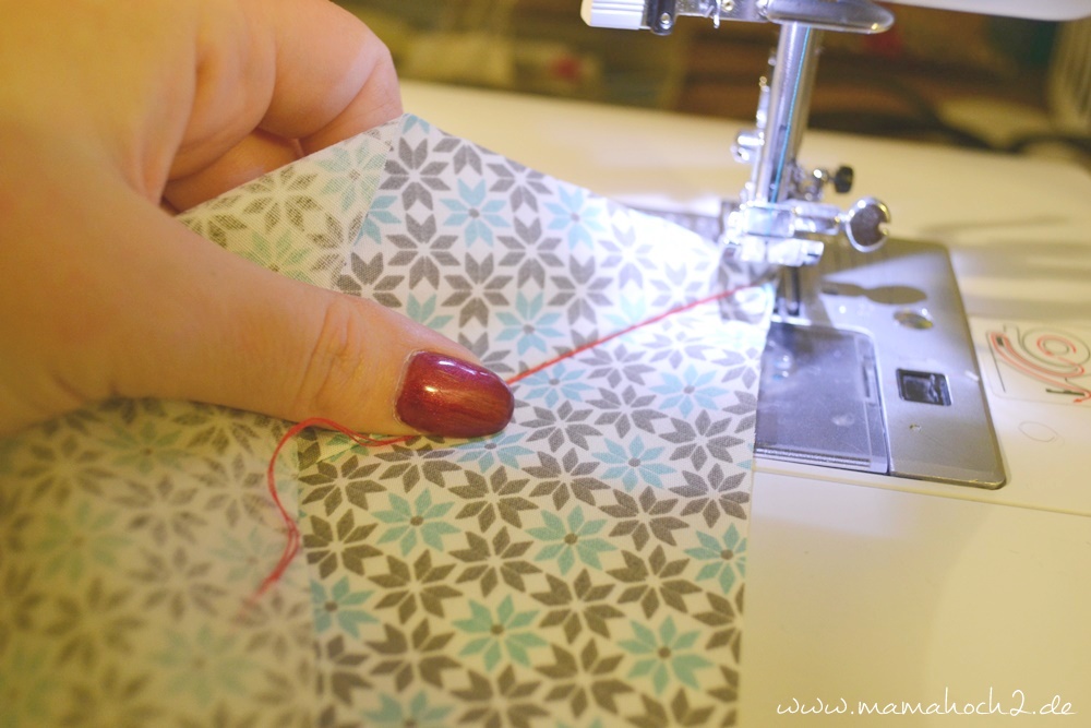 Wenn du in der Ecke angekommen bist, lasse die Nadel im Stoff, hebe dein Nähfüßchen und wende den Wimpel. Wenn du jetzt langsam zurück nähst, kannst du an deinem “Eckenfaden” leicht ziehen und so deinen Wimpel nach hinten ziehen. Dadurch bekommst du eine gleichmäßige Ecke genäht.