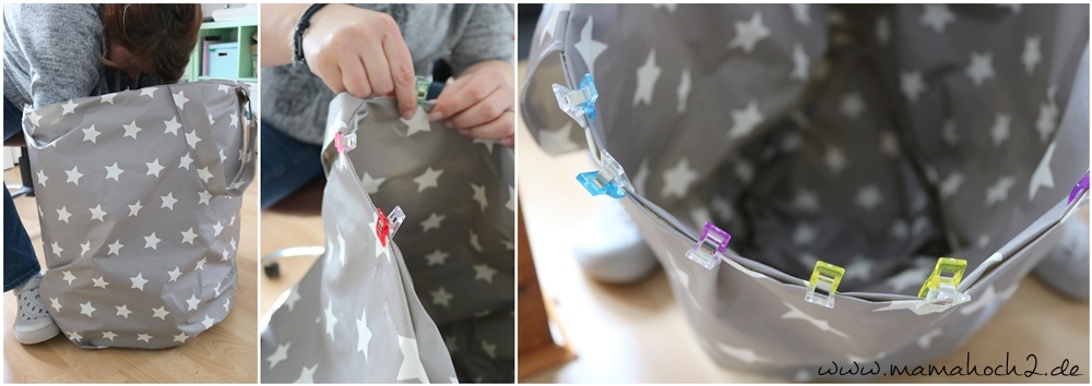 Nach dem Wenden brauchst du etwas Platz. Denn du musst die zwei zusammen genähten Teile ineinanderstecken und dein Utensilo in Form bringen. Steppe dann die obere Kante einmal rundherum ab und FERTIG ist der perfekte Platz für die ganzen Kissen, Decken und Stofftiere. Wenn du ein großes Kind hast, könntest du das Utensilo auch als Wäschetonne benutzen.