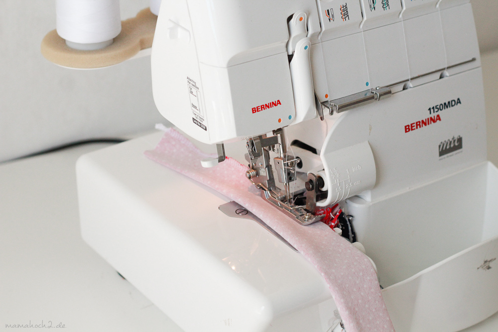 Schließe mit der Overlock die Schnittkanten. Wenn du keine Overlockmaschine hast, kannst du auch die normale Nähmaschine mit einem Zickzackstich oder Overlockstich verwenden.