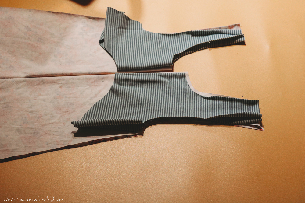 Jetzt ist der “schlimmste Teil” schon überstanden. Du nähst nun die Teile wie gewohnt bei einem Latzkleid zusammen. Schließe hierfür zuerst die kurze Kante der Belege, indem du sie rechts auf rechts legst. Danach widmest du dich den 2 Hauptteilen und schließt auch da die Kante unter dem Achselausschnitt. Solltest du dir da noch sehr unsicher sein, empfehle ich dir einen Blick in die Basisanleitung zum Tulip Rockers zu werfen.