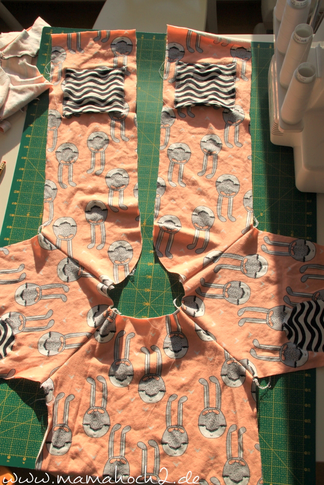 Nun positionierst du die beiden entstandenen Teile auf deinen beiden Vorderteilen. Bedenke an dieses Stelle nochmals, dass der Saum später nach hinten geschlagen und festgenäht wird. Setze die Tasche also nicht zu tief, da sonst die Saumnaht eventuell darüber verläuft. Ich habe daher nach unten 8,5cm Platz gelassen. Stecke dir die Taschen mit Stecknadeln fest und nähe sie mit der Nähmaschine an.