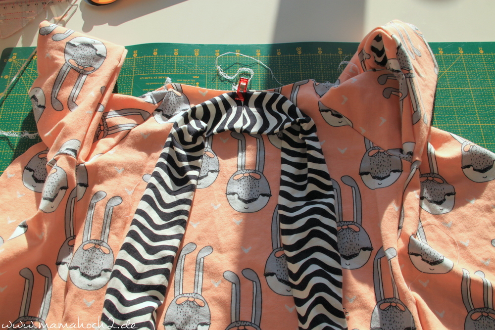 Zum Schluss wird die Rundung grob zusammen geclipst. Die Blende ist an dieser Stelle nun wahrscheinlich etwas größer als der Bogen an der Jacke. Das ist so gewollt, denn beim Annähen dehnst du den Stoff auf die Länge der Blende. Aus meiner Erfahrung heraus kann ich sagen, dass sich dadurch der Stoff schöner legt beim Tragen.