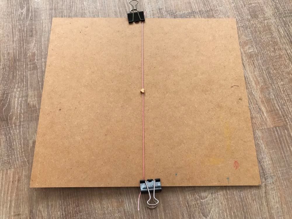 Zuerst nimmst du dir ein ca. 20cm langes Stück Schnur. Diese klemmst du dir am besten oben und unten an einem Brett fest. Je straffer das Band ist, umso leichter lässt es sich knüpfen.