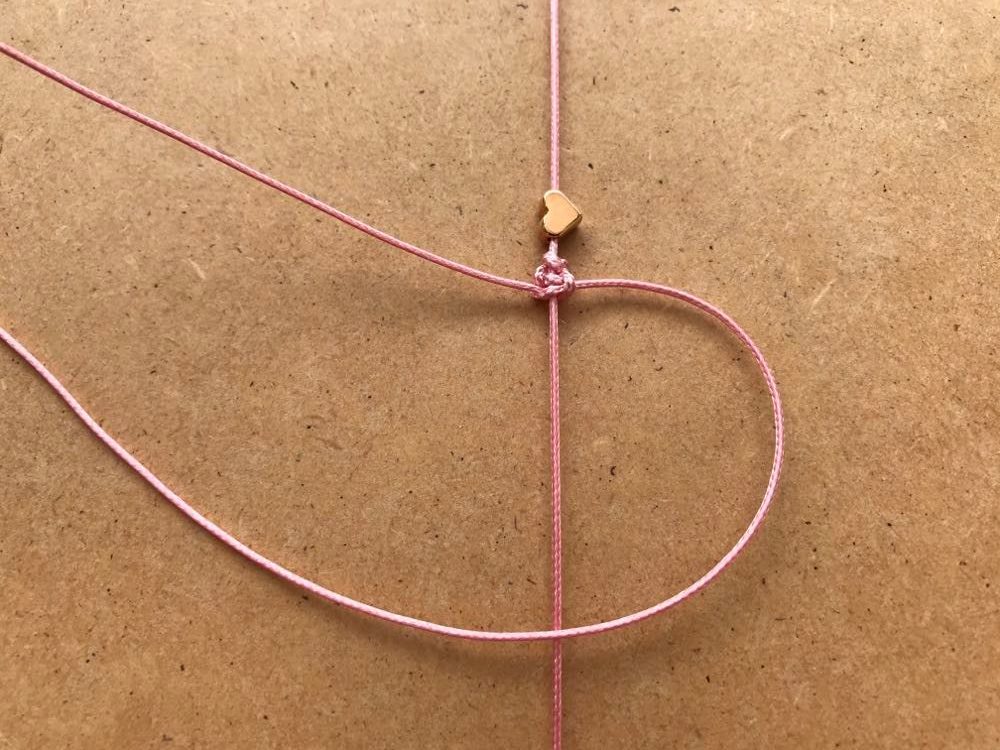 Wenn du ein Element (bei mir hier ein Herz) einarbeiten möchtest, schiebe dir dies vorab auf die Schnur und positioniere es mittig.