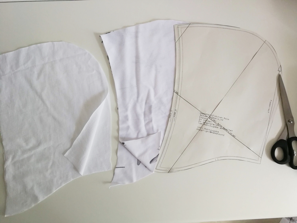Wenn du die Kapuze auch doppelt nähen möchtest, brauchst du eine Innenkapuze und eine Außenkapuze. Ich habe für die Innenkapuze einen leichten farblich passenden Jerseystoff benutzt.