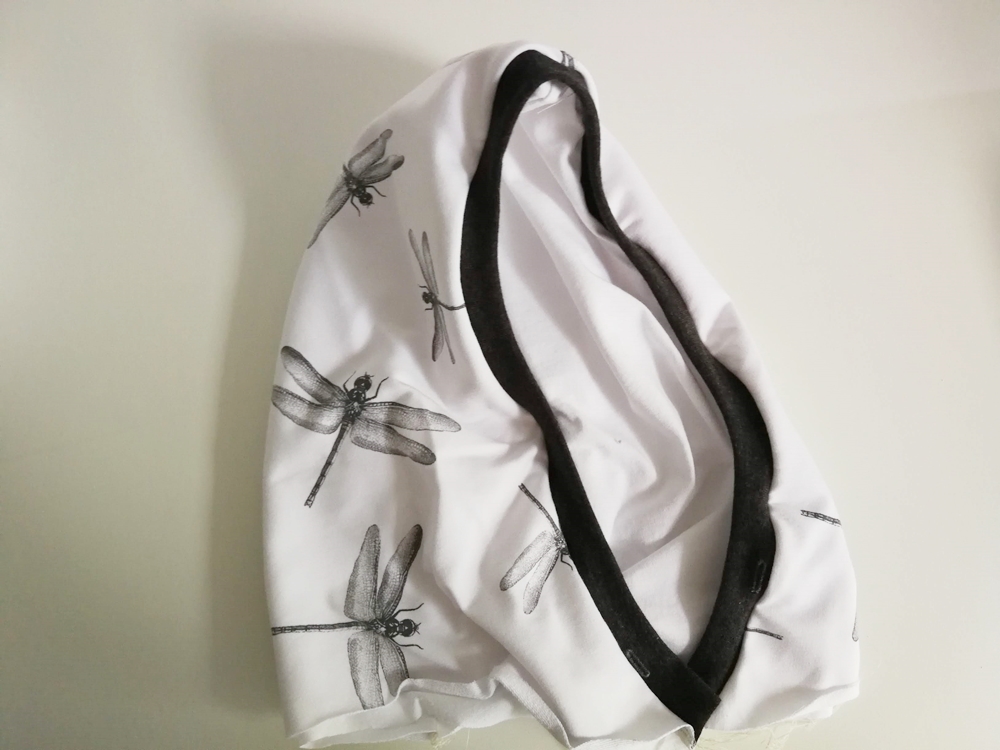 Anschließend wendest du die Kapuze so, dass auf beiden Seiten je die rechte Stoffseite zu sehen ist.
