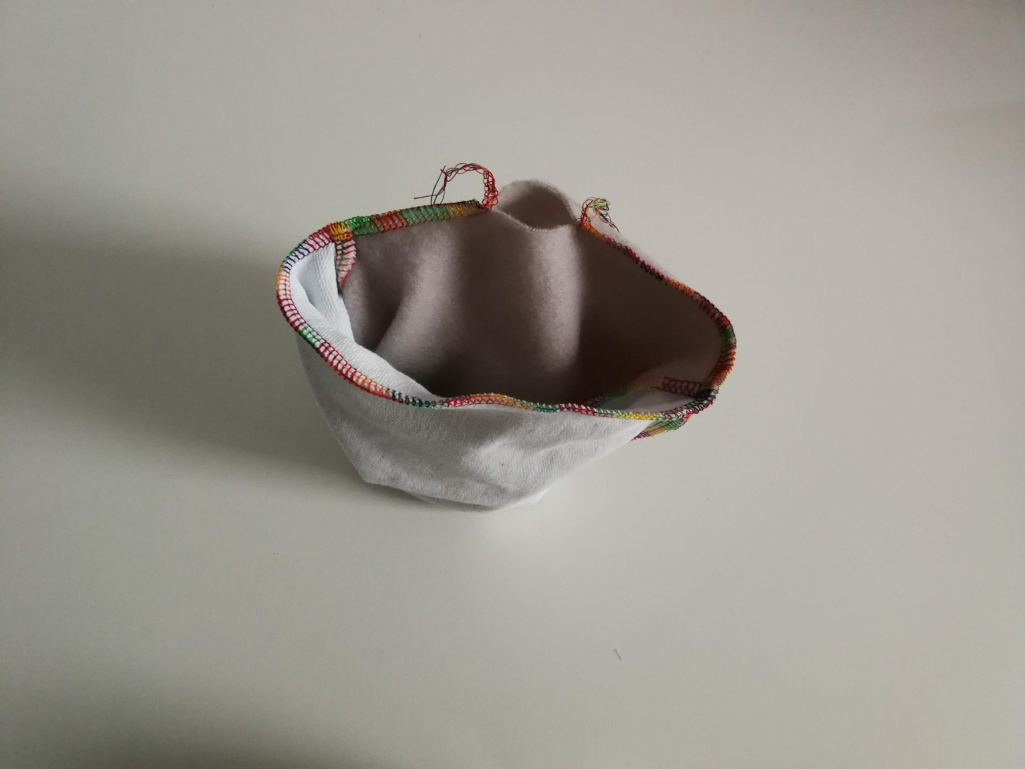 Setze dich wieder an deine Nähmaschine oder Overlock und schließe die offene Naht. Aber lasse eine Wendeöffnung! Am besten lässt du die Wendeöffnung auf der kuscheligen Innenseite, so dass du die Wendeöffnung durch einen einfachen geraden Stich schließen kannst und man die Naht am Ende nicht sieht.