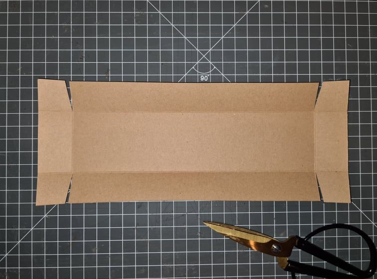 Falte nun die Falzkanten genau und streiche sie kräftig, damit sie eine schöne Kante ergeben. Schneide an den Enden die Falzkanten ein, damit du die Ecken einfalten und kleben kannst. Achte darauf, dass du die Kante, welche eingeklappt wird, etwas schräg anschneidest, damit diese nicht innen anstößt und oben übersteht.
