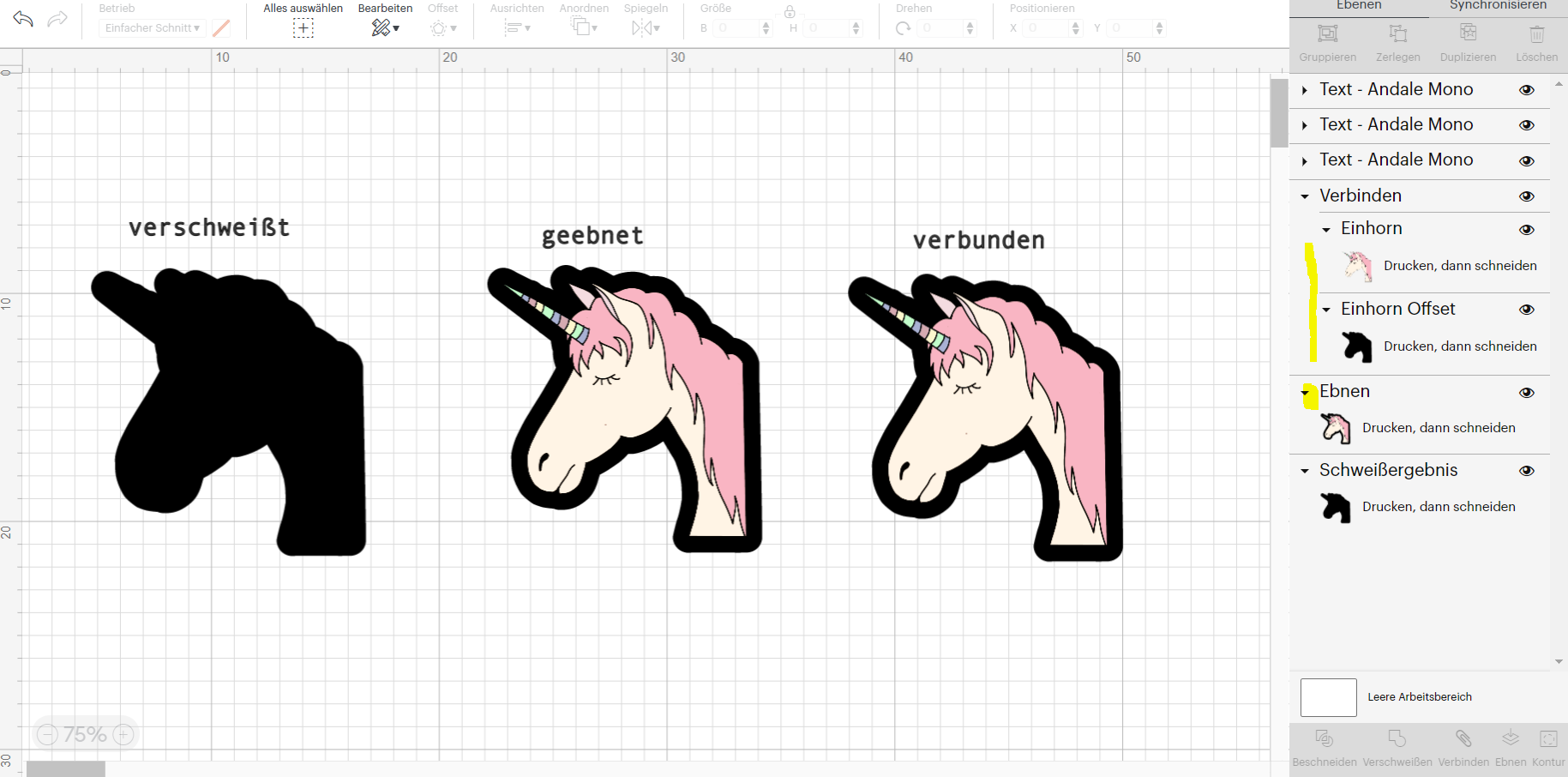 Du siehst hier auch direkt, warum bei geplanten Stickern verschweißen keinen Sinn macht. Das Motiv würde sozusagen verschluckt werden. Die Funktion verbinden, sieht ganz ähnlich aus, aber wenn du einen Blick auf die Ebenen auf der rechten Seite wirfst, dann siehst du, dass dort zwei Elemente einfach nur “zusammengefügt” wurden. Dementsprechend würde der Plotter diese beiden Elemente auch als Schnitt erkennen und das Pferd vom Offsetrand getrennt schneiden. Je nach Anforderungen und Ideen, ist es also zu überlegen, welche der drei Funktionen am meisten Sinn macht.